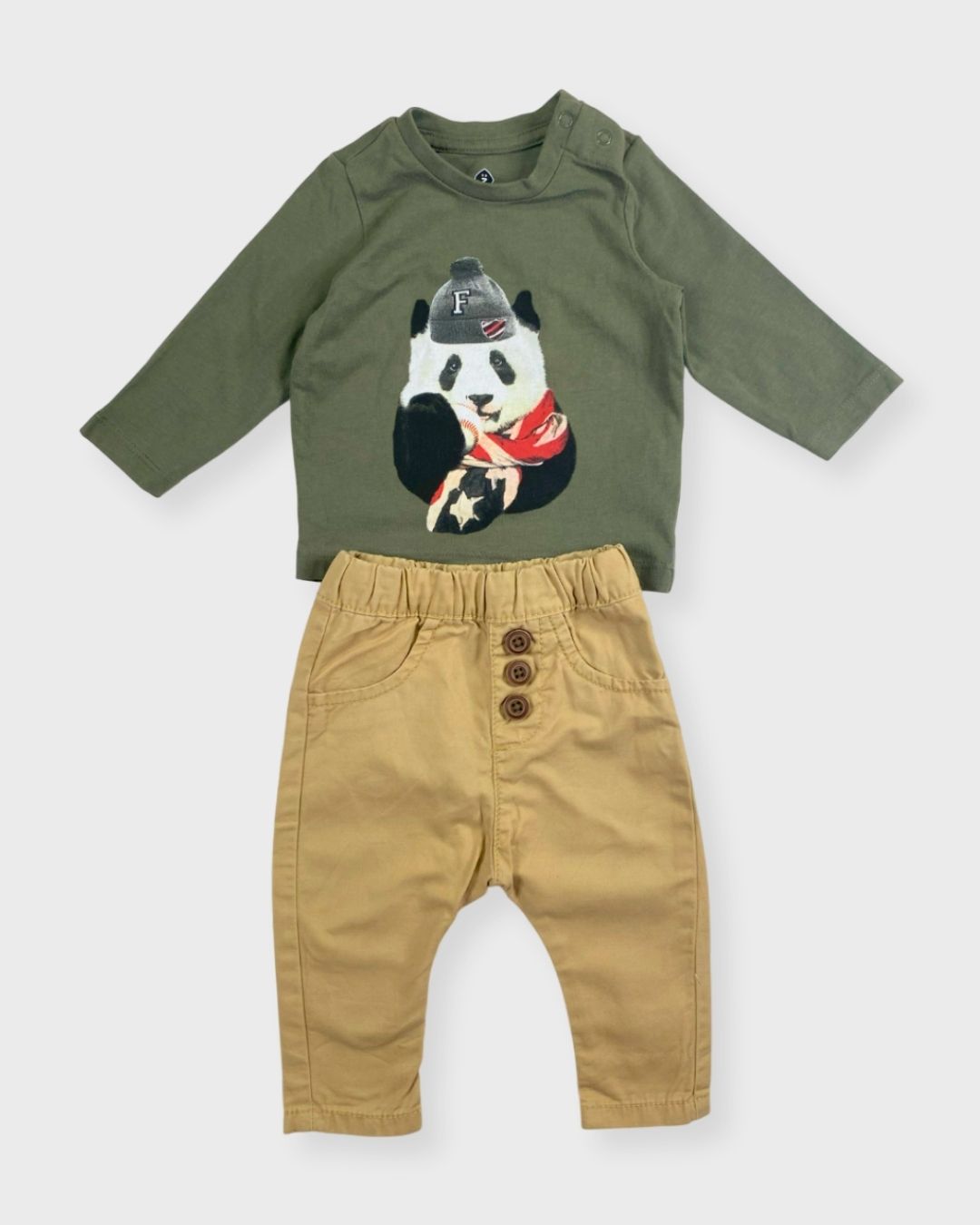 Look mi-saison tout en douceur : un pantalon Tape à l’œil associé à un t-shirt manches longues Grain de blé avec un mignon panda. Ludique et tendance. 🐼💚