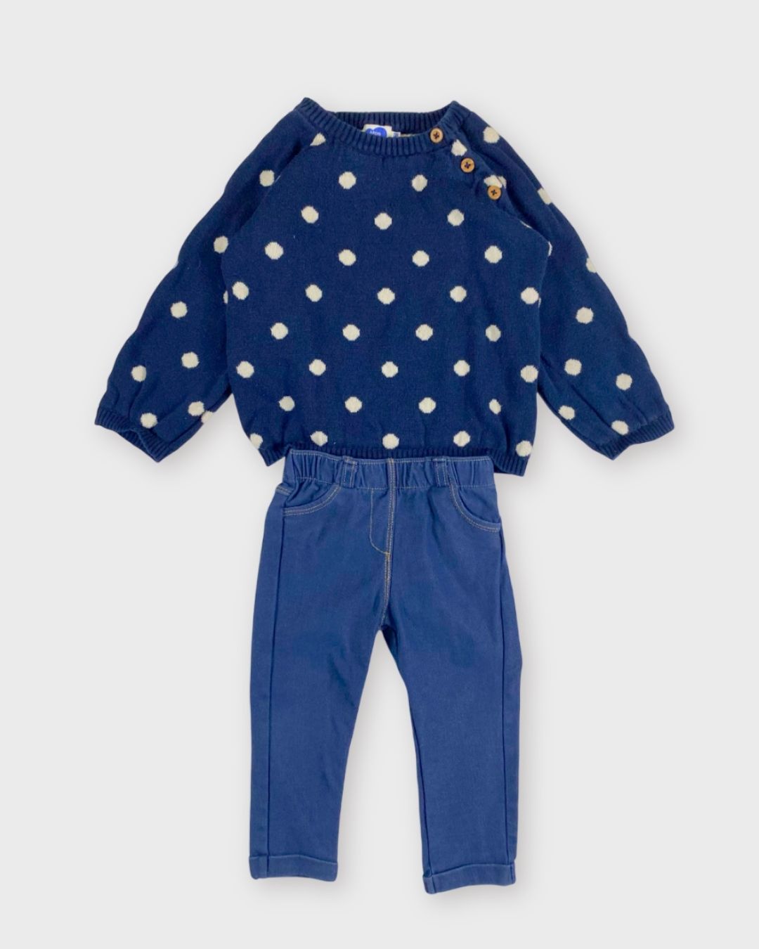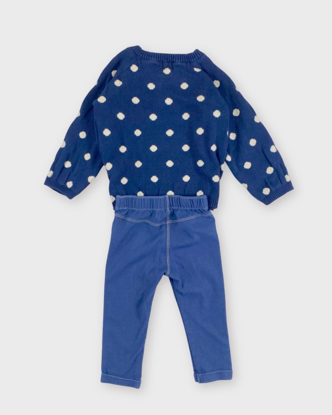 Pull à pois Mots d’Enfants et jegging Kiabi. Un look tendance et confortable.