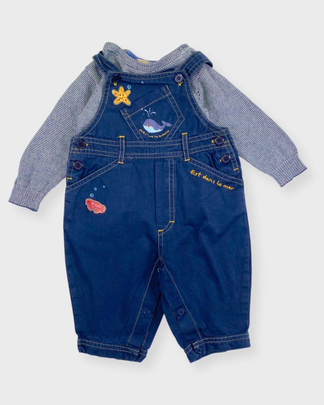 Salopette bleue Culbuto et pull marinière fin Boîte à Malice. Un look marin intemporel. ⚓💙