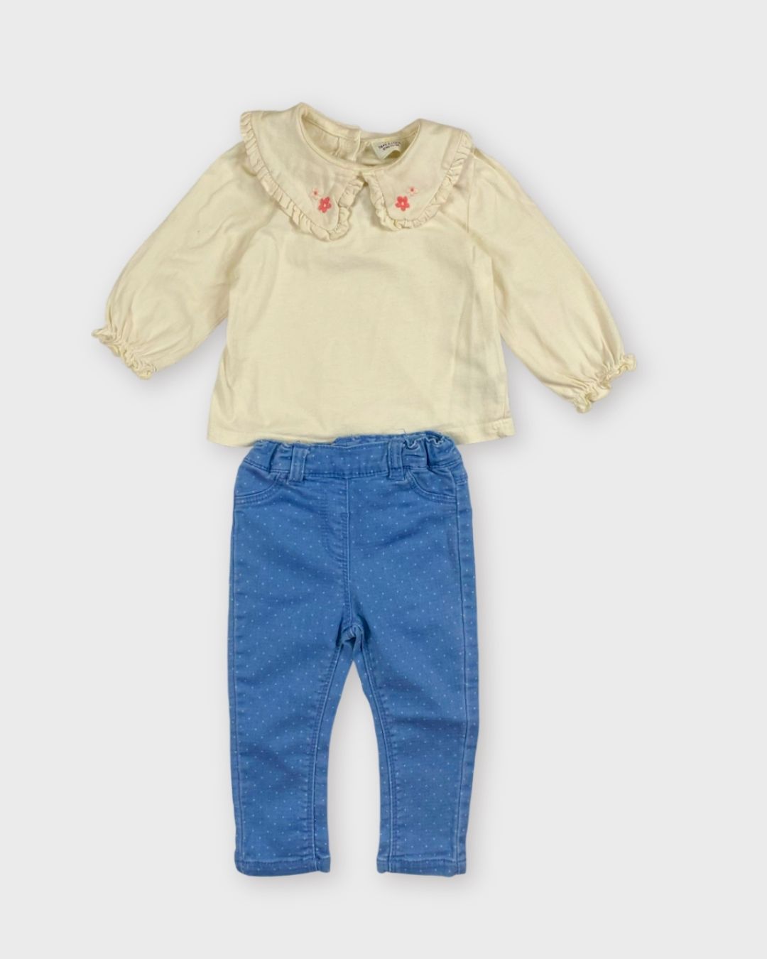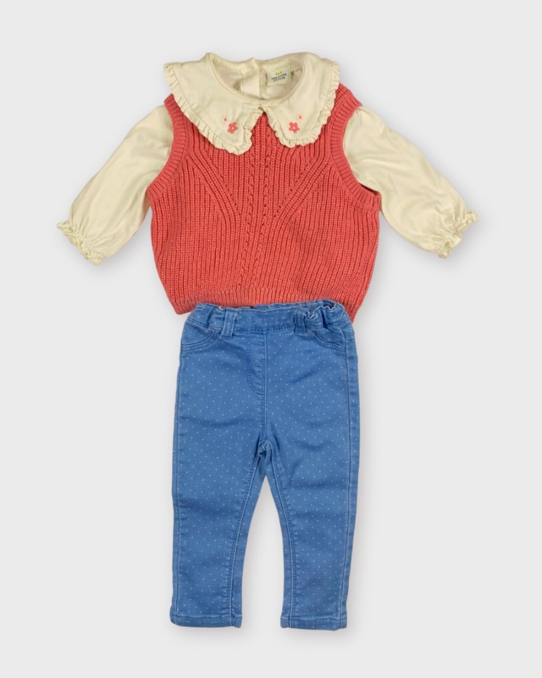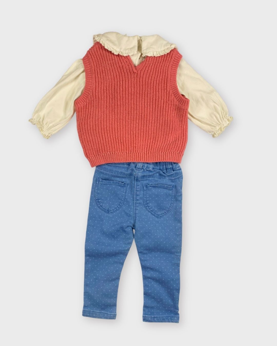 Un style élégant et adorable : jean Pat et Ripaton, blouse et gilet manche courte Tape à l’œil. Une tenue raffinée pour toutes occasions.