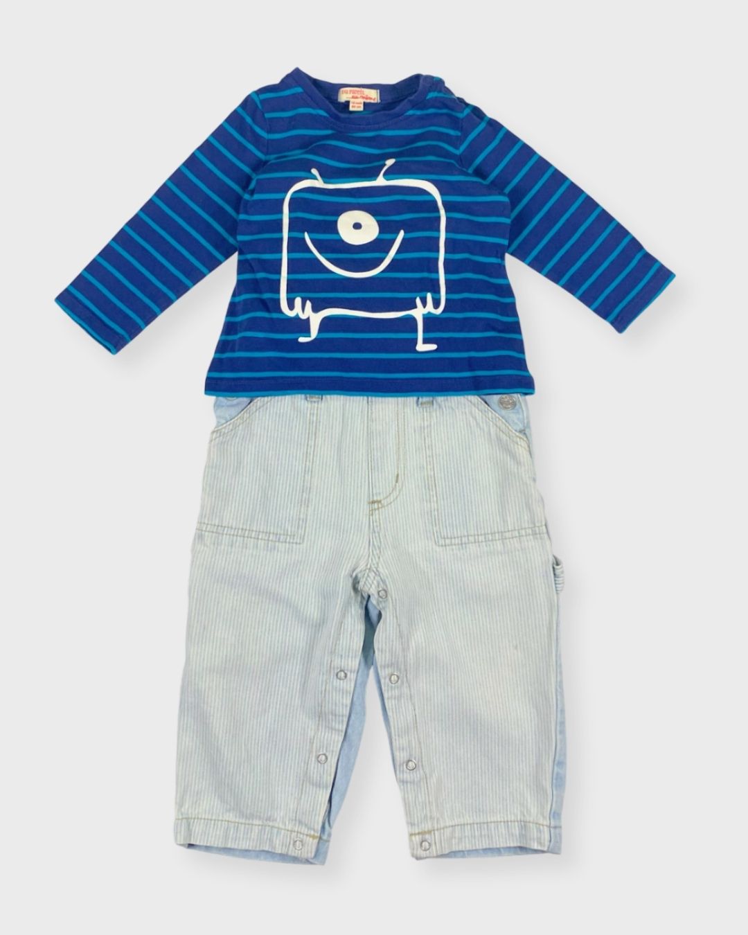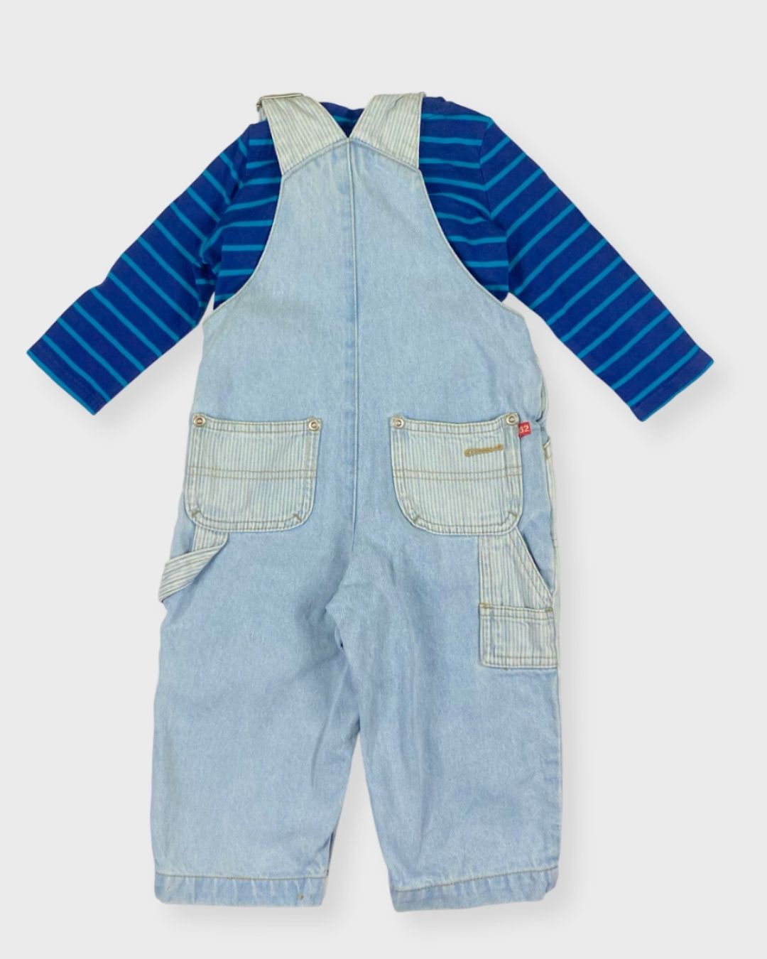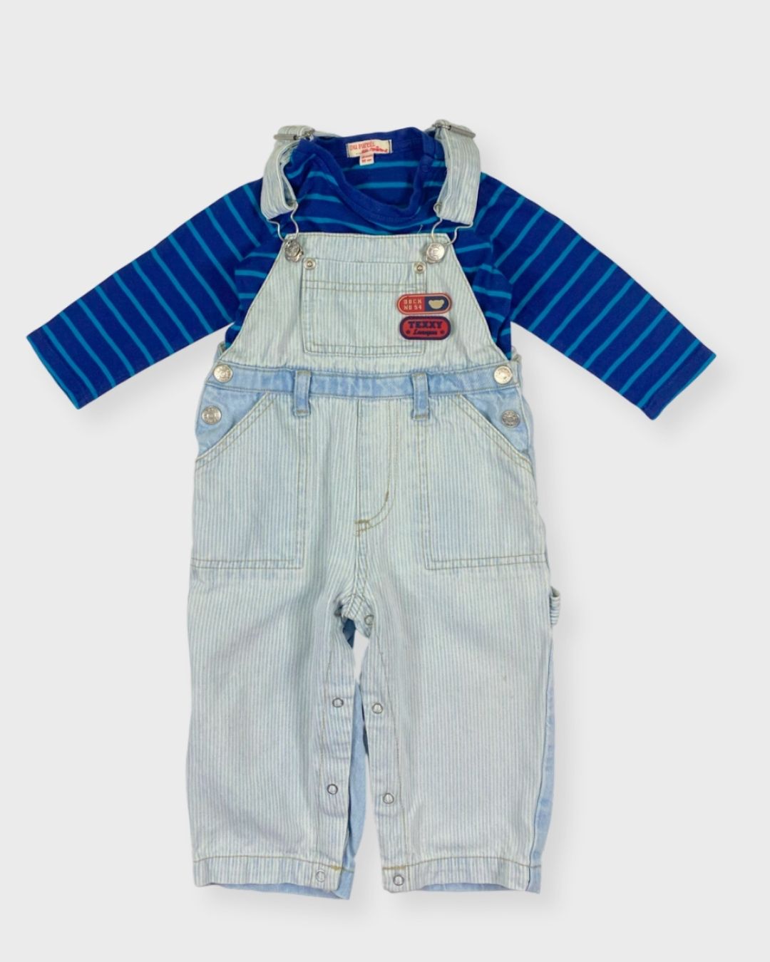 Salopette rayée en jean Tex et t-shirt Du Pareil Au Même. Look rétro et aventurier. ✨
