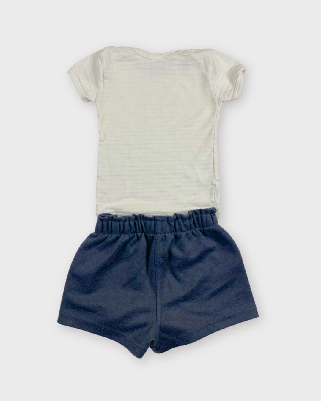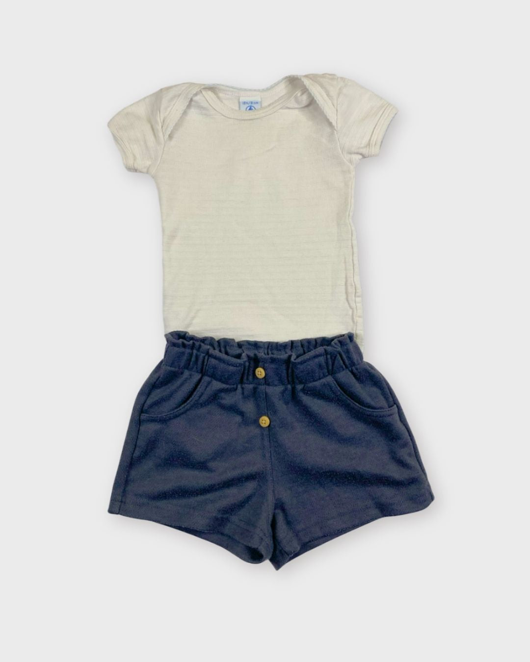 Un short chic gris Gemo et un haut juste-corps blanc Petit Bateau. Une tenue estivale élégante.