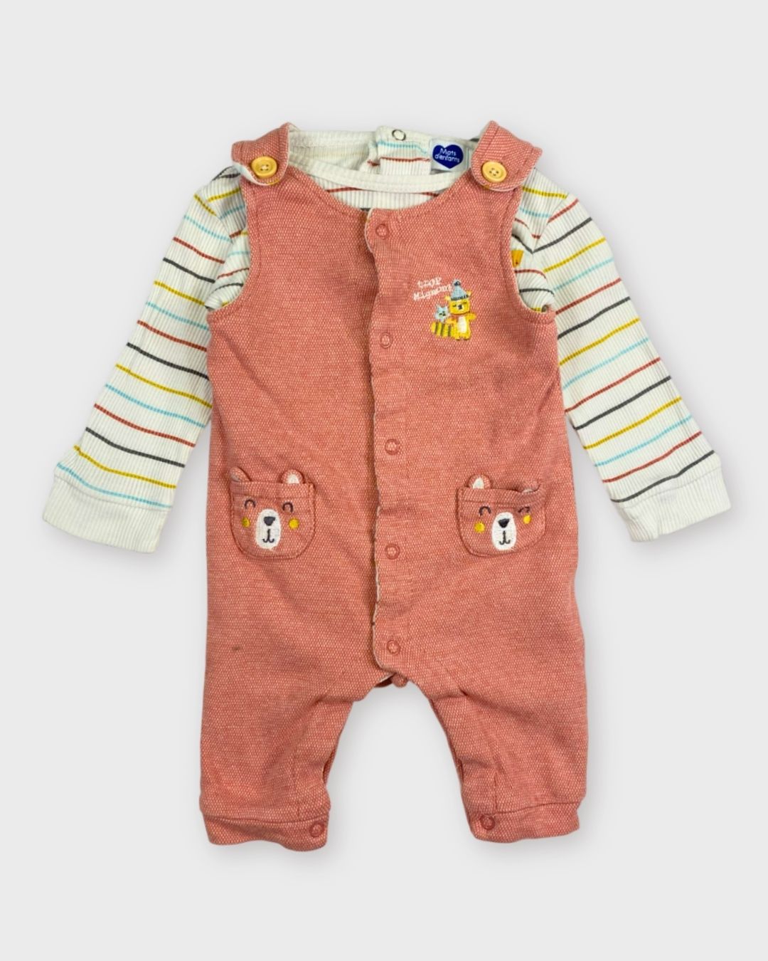 Adorable tenue avec sa petite salopette Mots d'enfants et son t-shirt manches longues assorti. Confort et douceur pour les premiers mois ! ✨💕