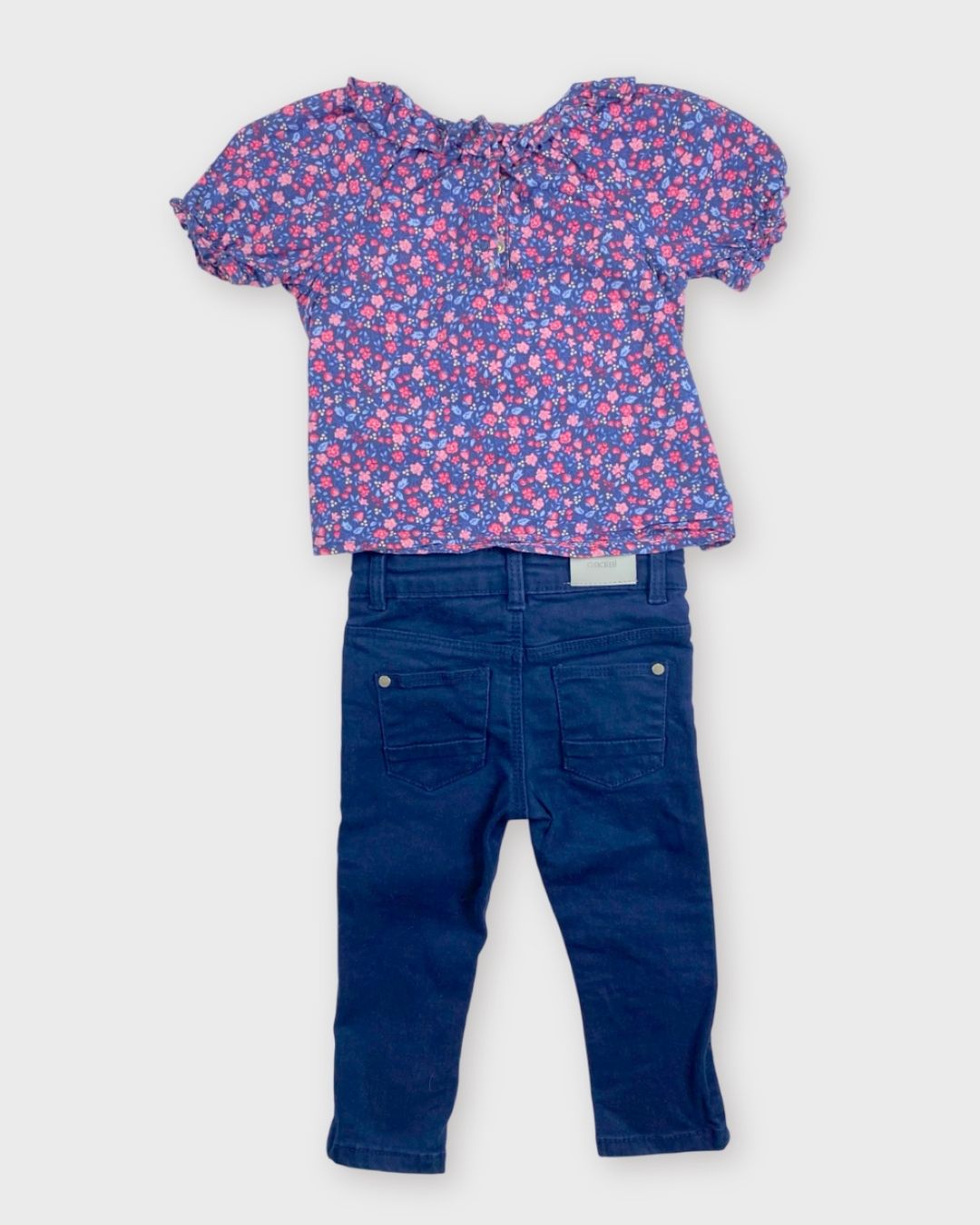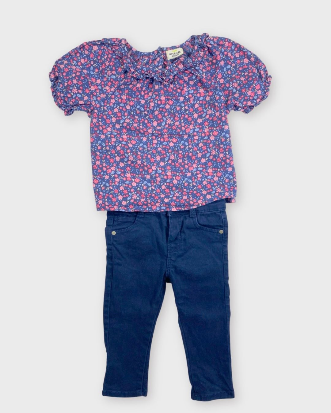 Un look du quotidien avec son pantalon bleu marine Obaïbi et son t-shirt fleuri Tape à l’œil. Frais et adorable pour les journées ensoleillées. 🌸