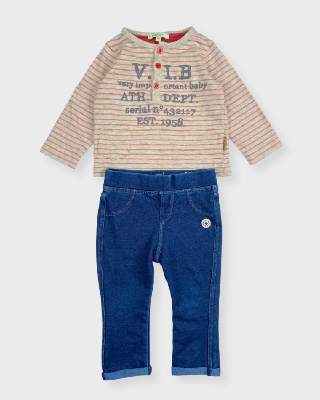 Un jean robuste Terre de Marin et un t-shirt manches longues Prémaman pour un style simple, pratique et adorable. 🧸💙