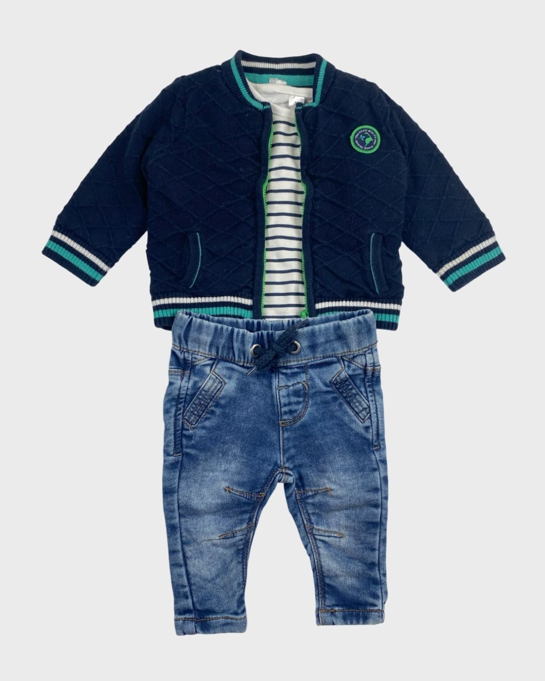 Un ensemble moderne et complet : jean, t-shirt manches longues et un gilet chaud Orchestra. Pratique et parfait pour le quotidien. 🌟