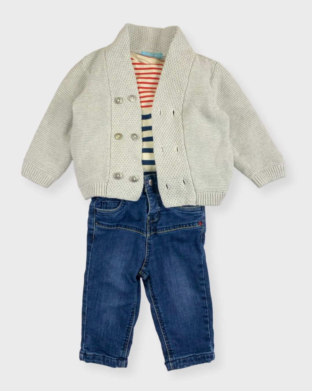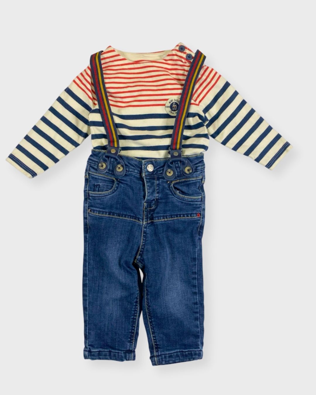 Jean à bretelles Orchestra, marinière Orchestra et gilet Obaïbi. Un look chic et irrésistible. 🎩💙