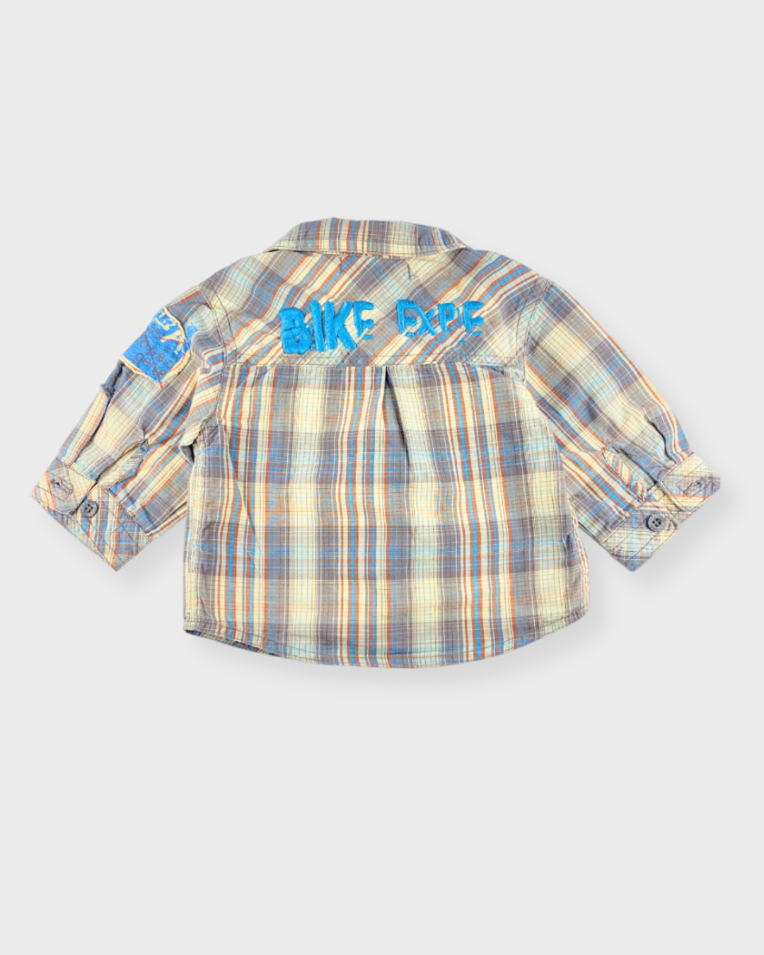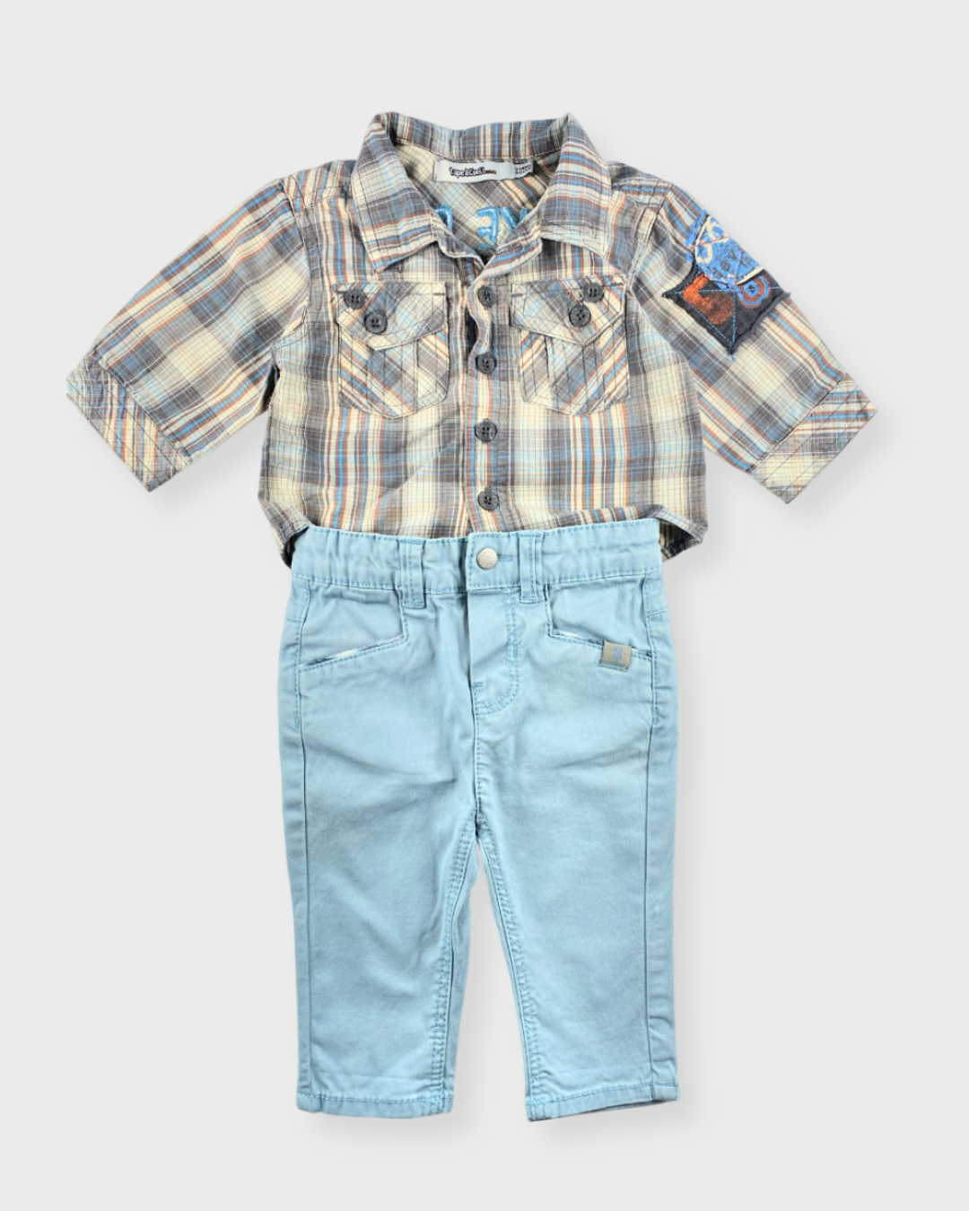 Petit look craquant avec la chemise à carreaux Tape à l’œil et le pantalon bleu ciel Obaïbi, un duo plein de douceur.