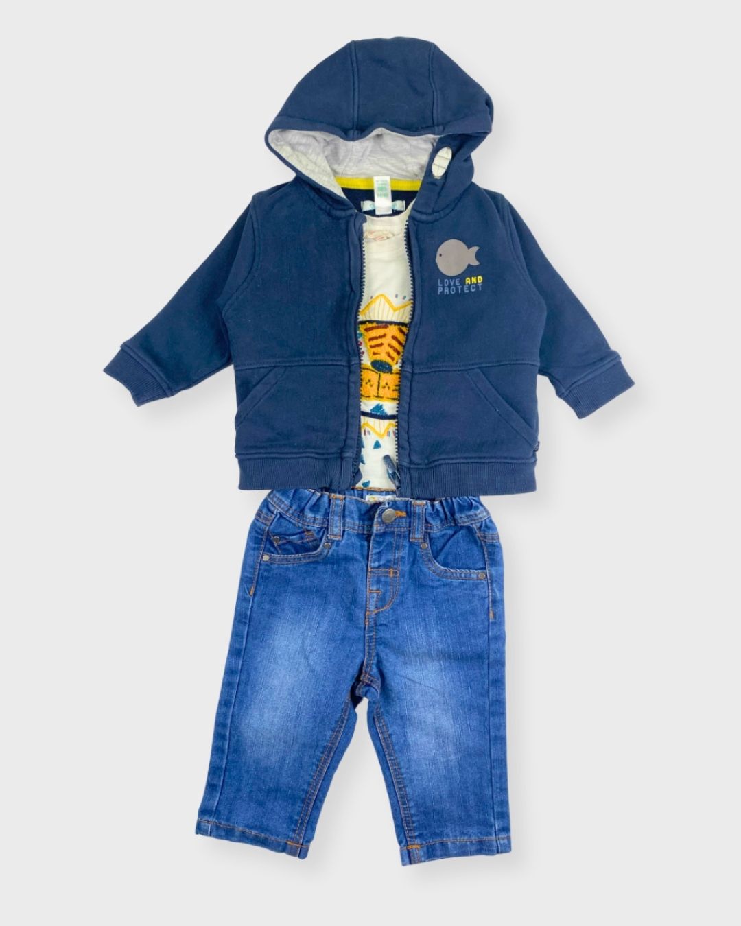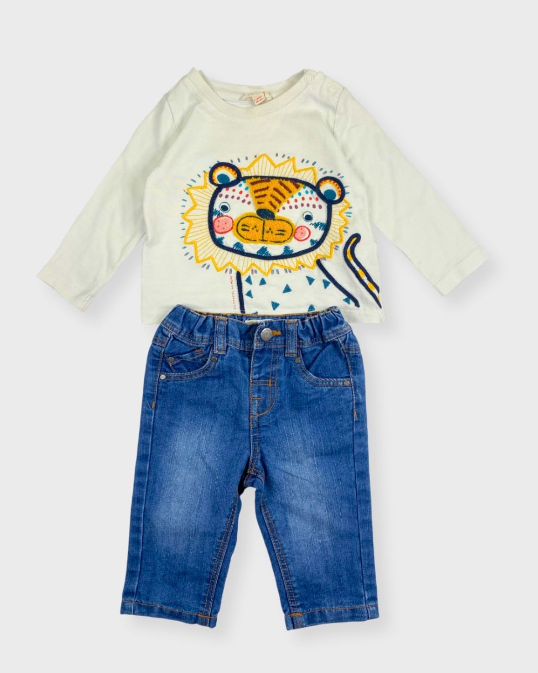 Un ensemble moderne et adorable : un jean confortable signé Kitchoun, associé à un t-shirt manches longues Du Pareil Au Même décoré d’un petit lion et un gilet douillet Obaïbi. Parfait pour les beaux jours et les petits explorateurs. 🦁✨