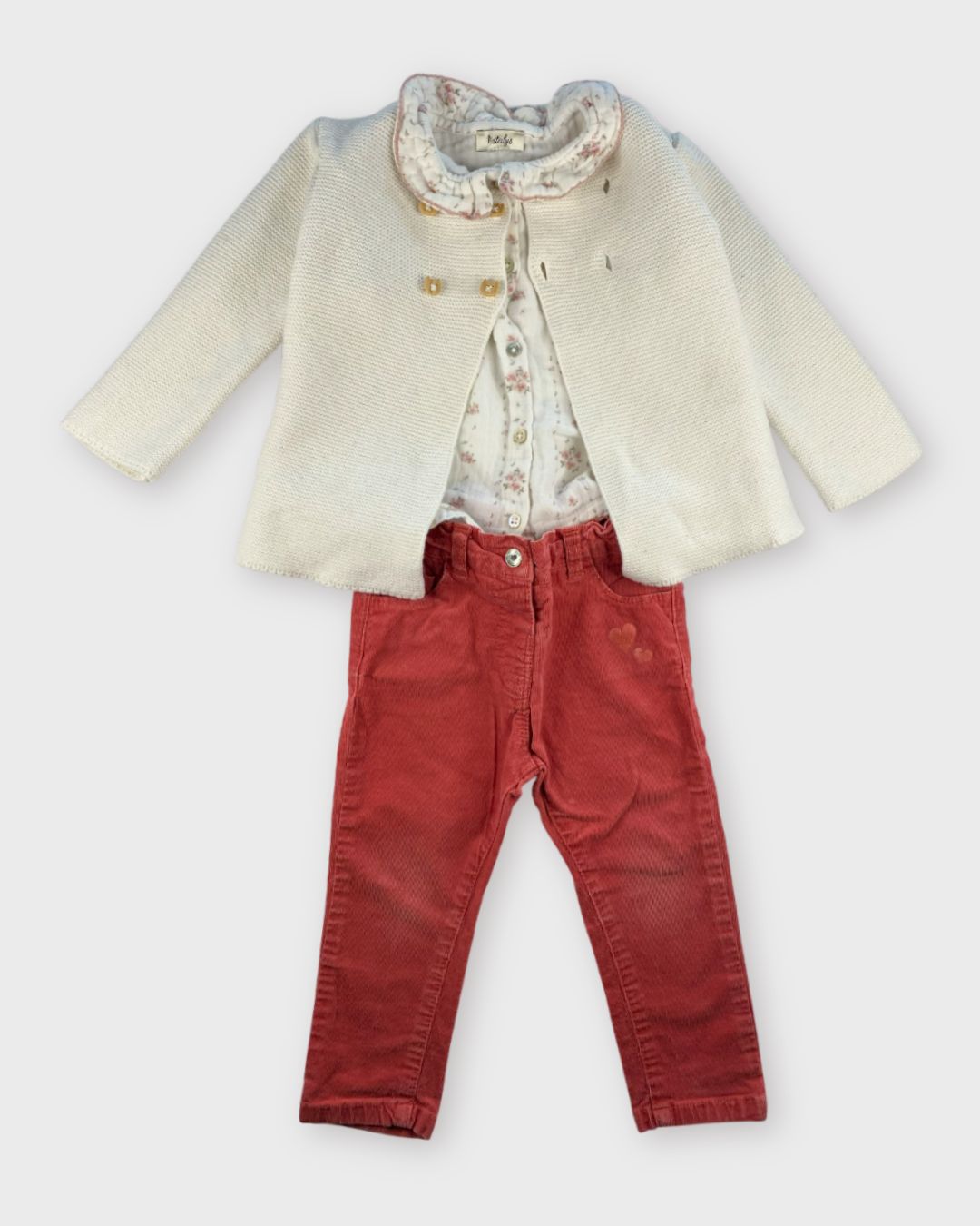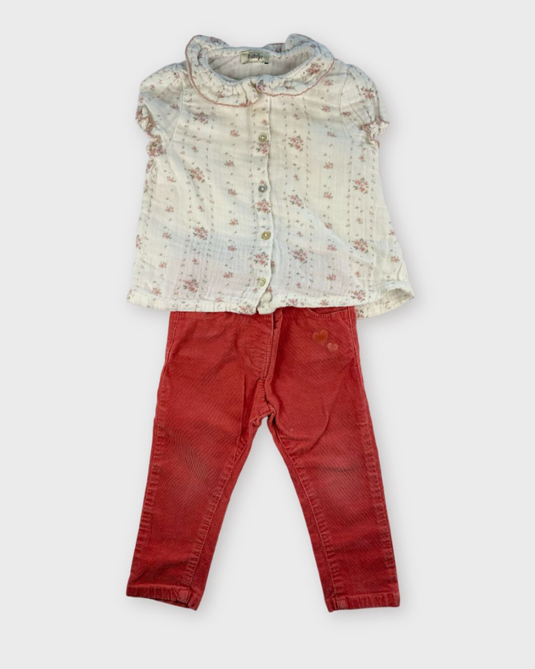 On adore ce look avec ce pantalon rouge de Gémo et sa blouse manche courte fleurit de chez Natalys et le gilet iconique de Tape à l'oeil.