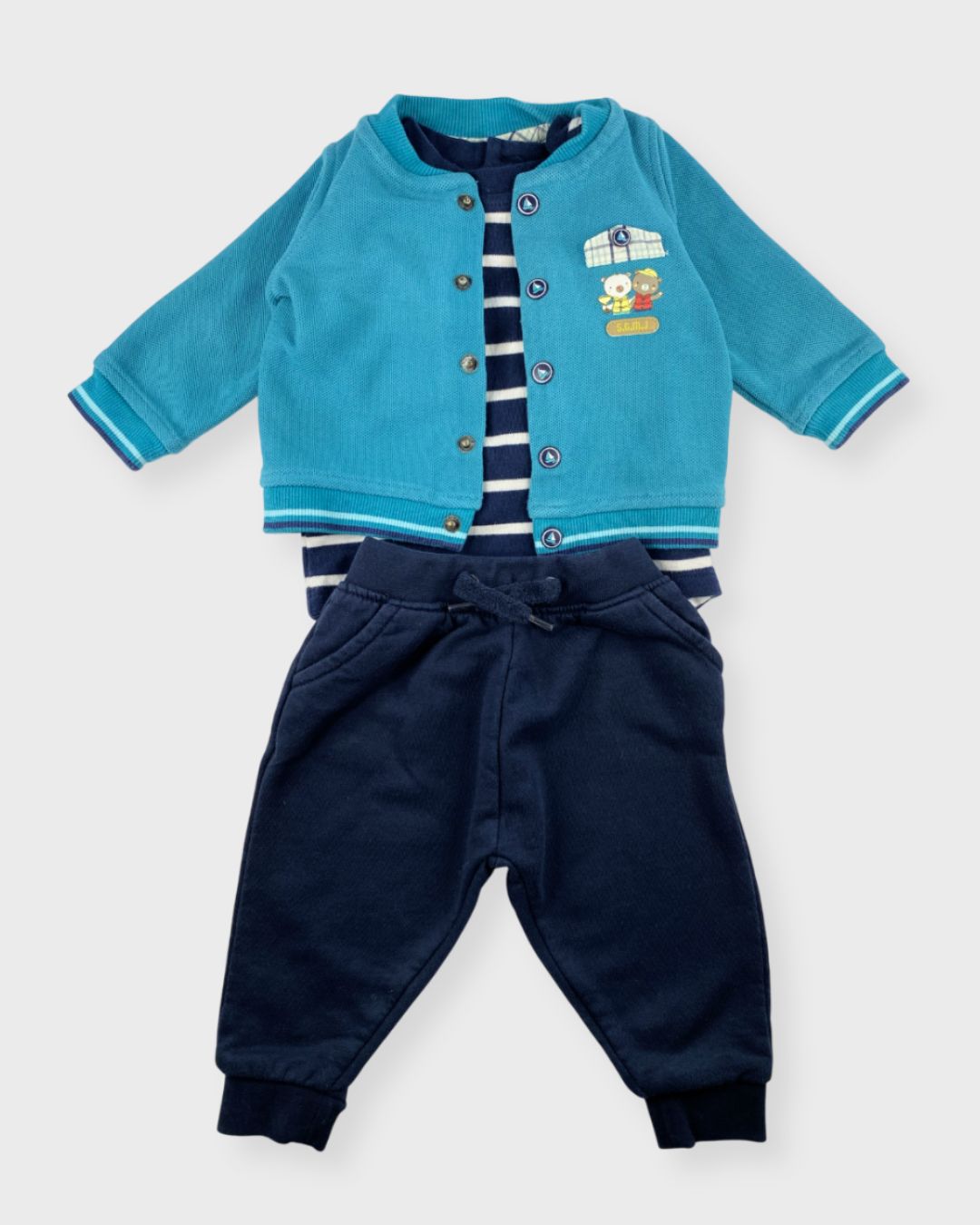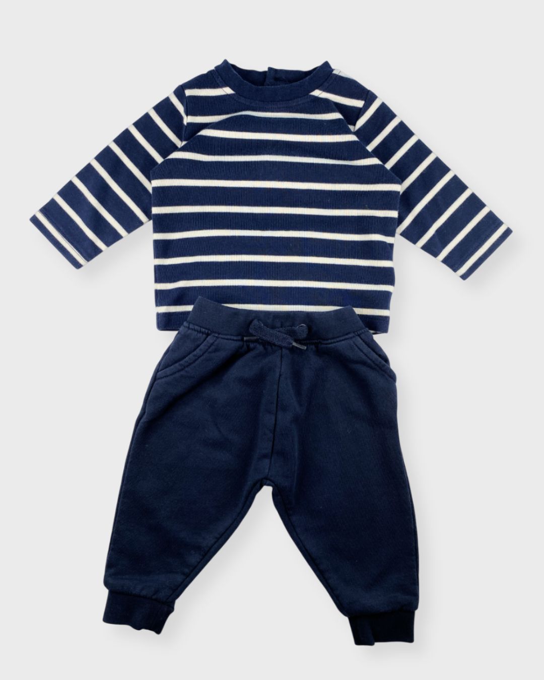 Ensemble trois pièces avec un pantalon Boite à Malice, son gilet Sergent Major et son tshirt marinière.