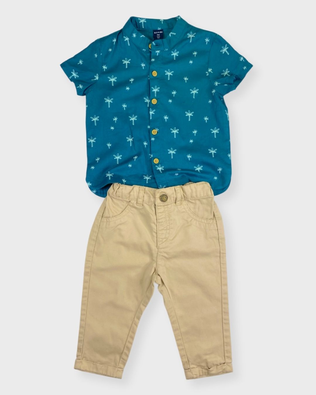 Un pantalon beige léger Kiabi et une chemisette palmier Kiabi pour un look estival adorable. 🌴☀️