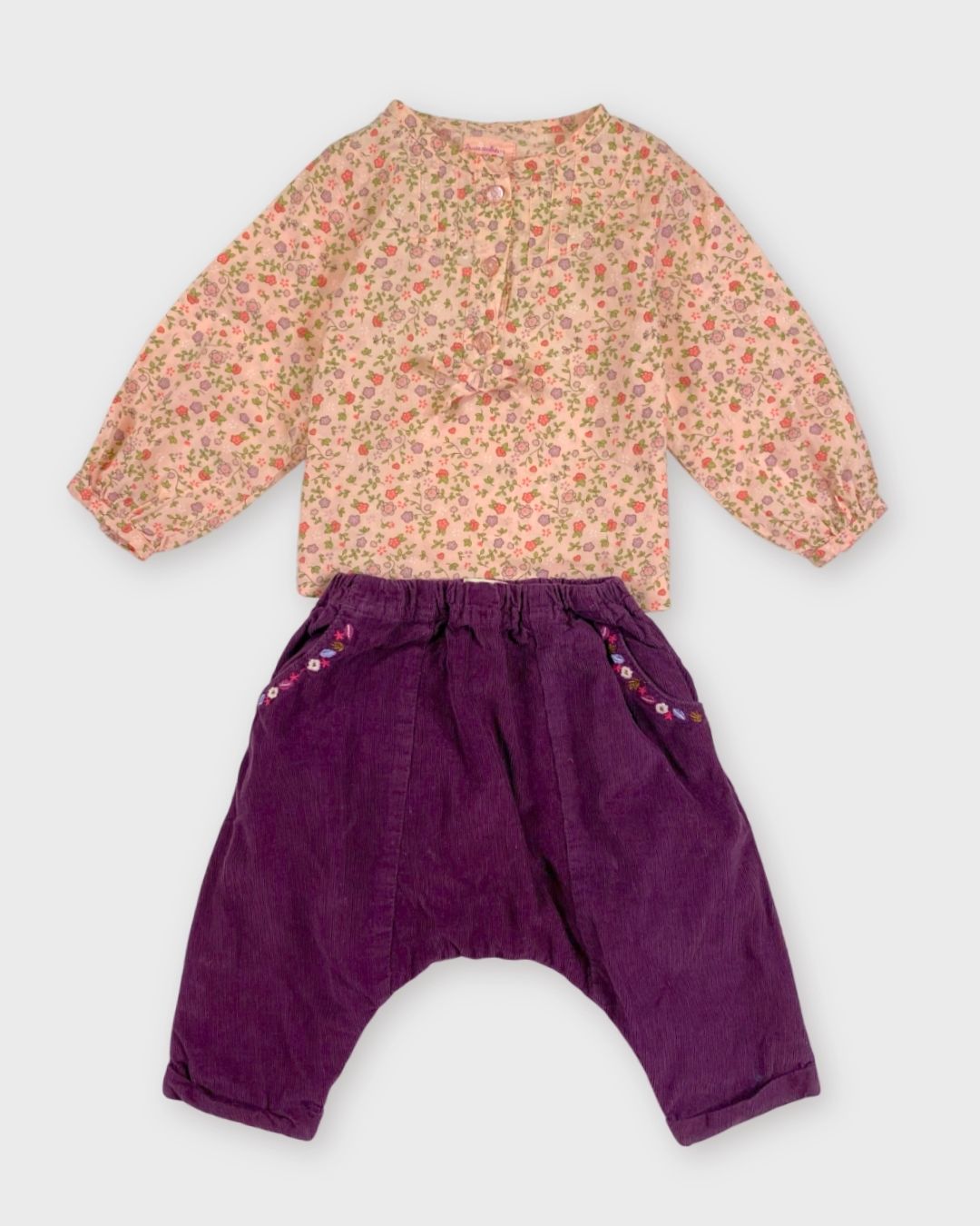 Un pantalon style velours mauve Du Pareil Au Même et une blouse fleurie Tissaia. Une tenue pleine de douceur. 💜