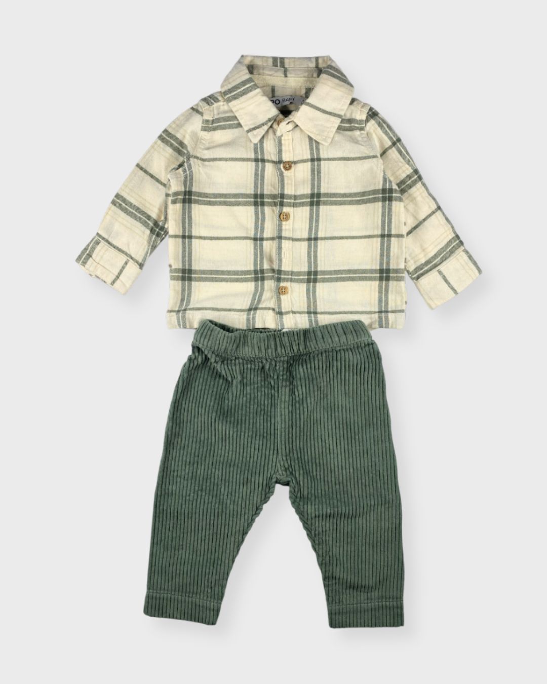 Cet ensemble casual en coton doux marie un petit pantalon velours NPO Baby et sa chemise à carreaux assortie.