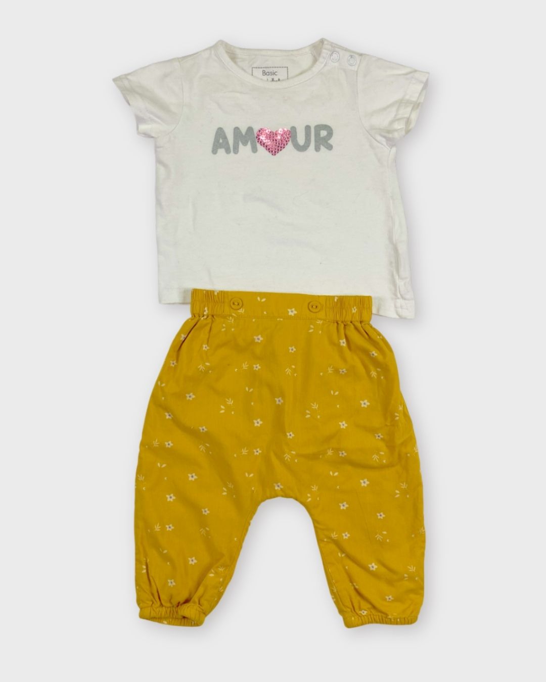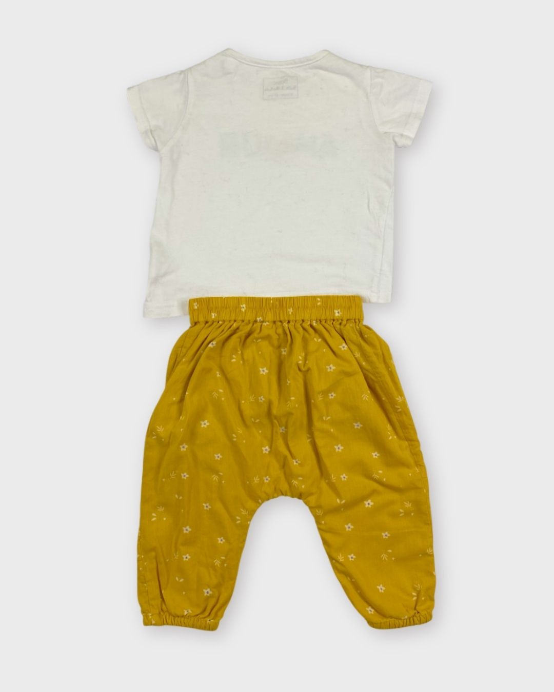 Un pantalon léger jaune à fleurs Kiabi et un t-shirt manches courtes Boîte à Malice. Moderne et estival. 🌻