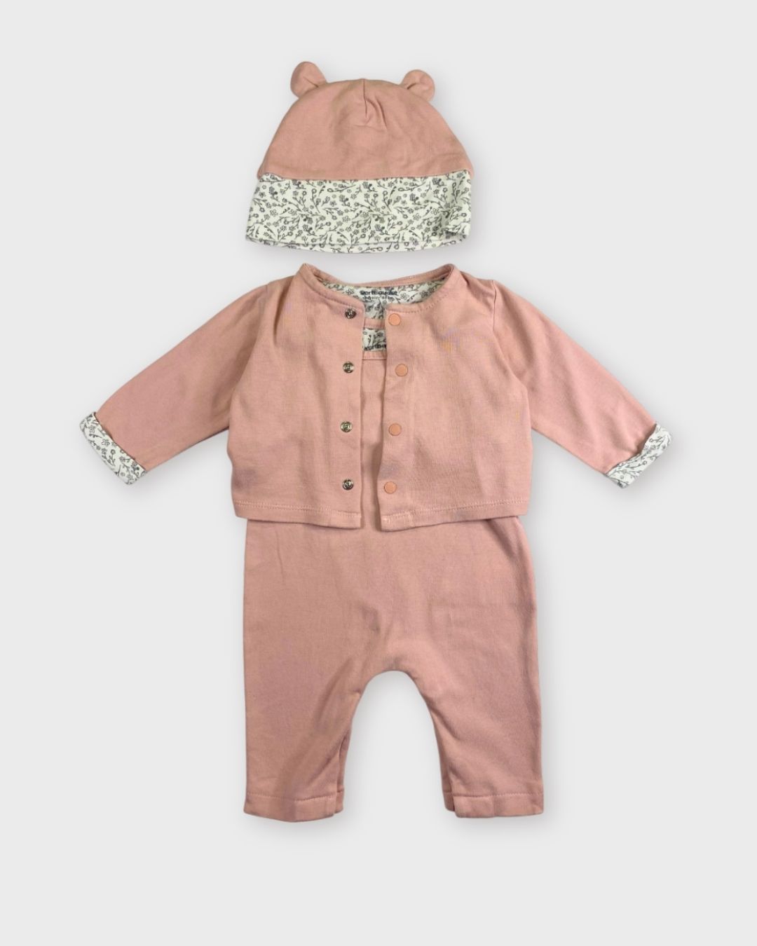 Un ensemble confort et rose signé Verbaudet : salopette, gilet assorti et son petit bonnet trop mignon. Parfait pour un look doux et craquant dès 3 mois. 🌸