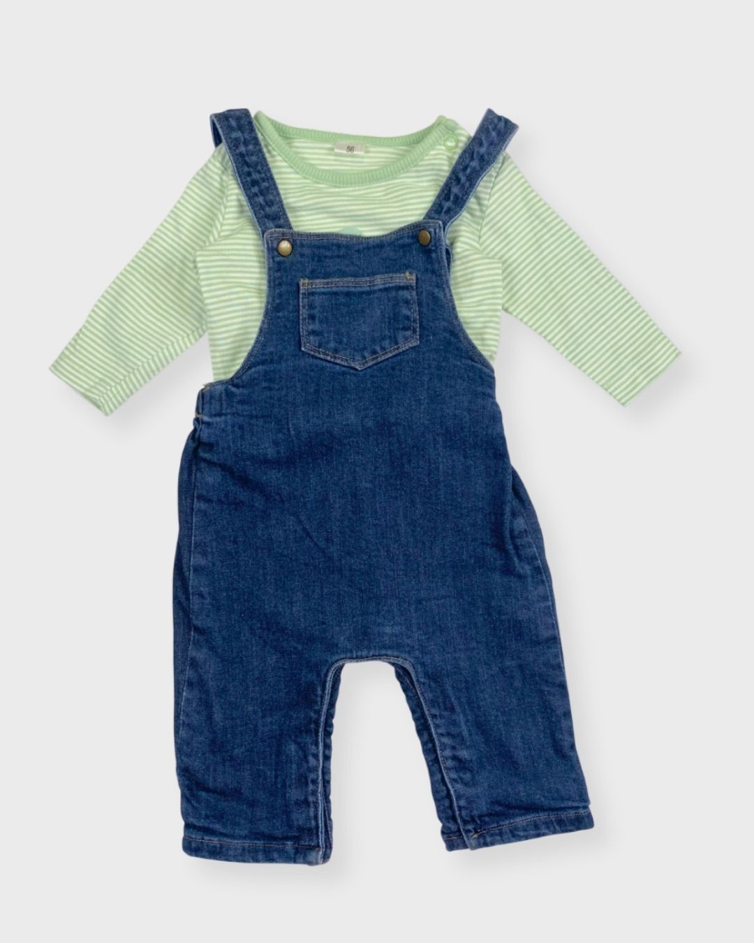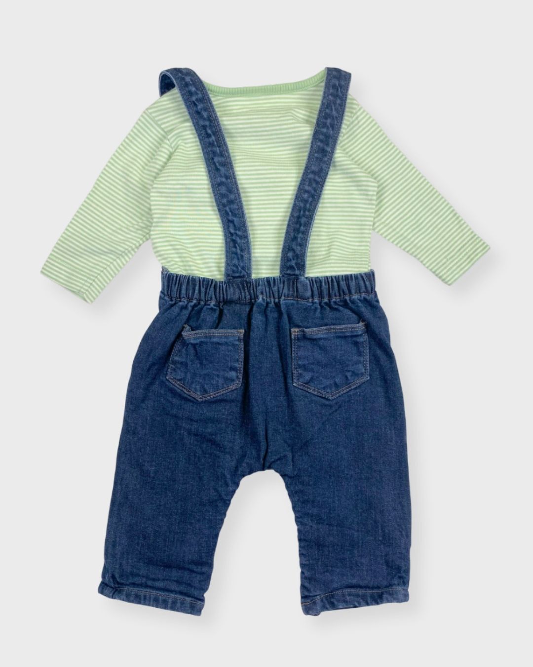 On craque pour cette salopette en jean Boutchou bio, associée à un t-shirt manches longues. Un look mi-saison simple, adorable et éco-responsable. 🌱✨