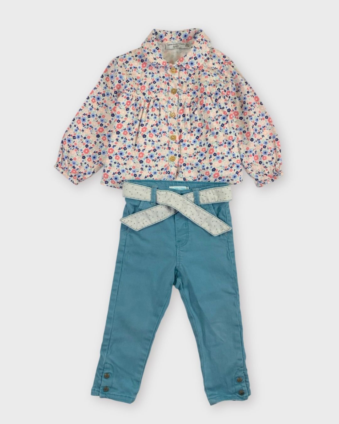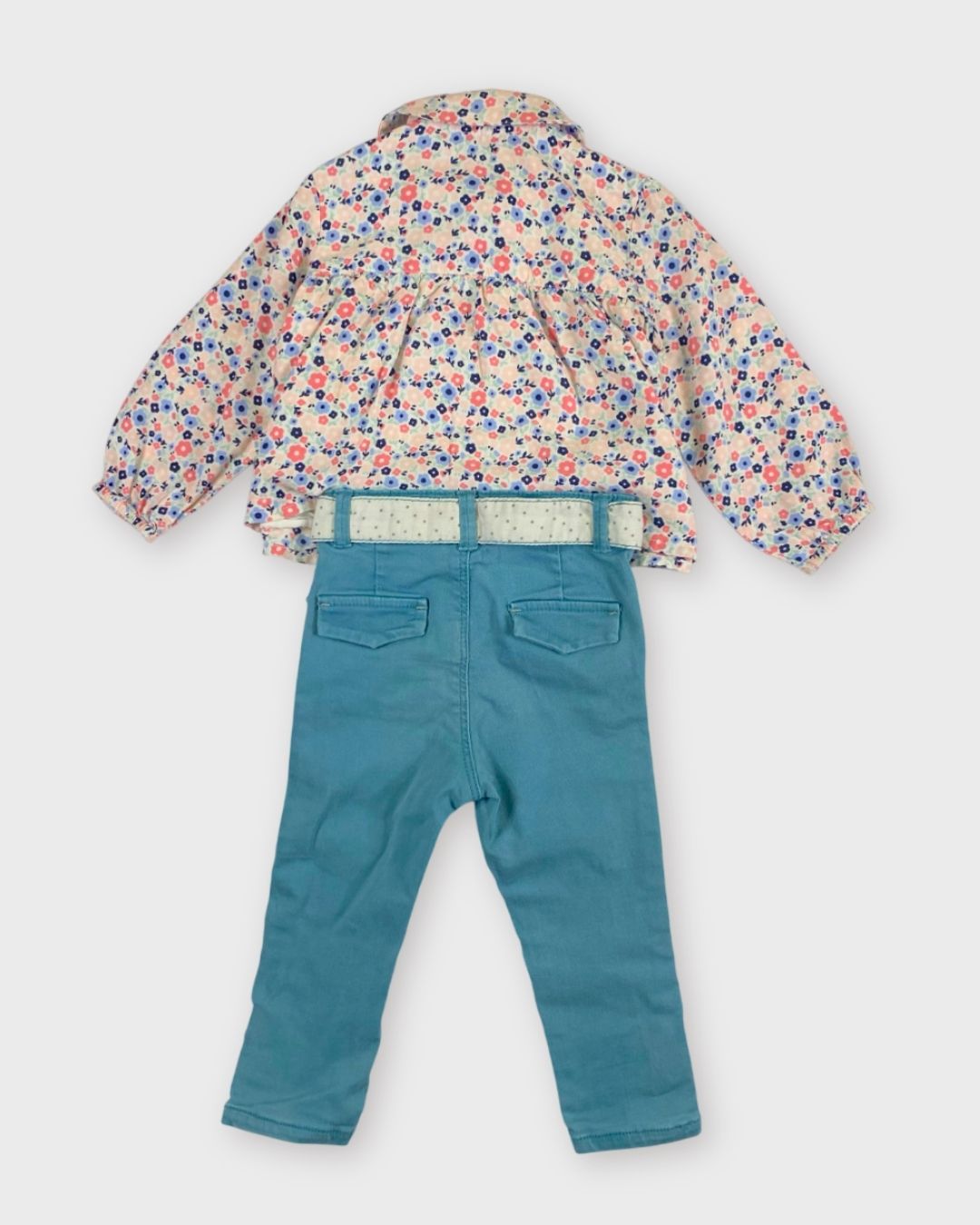 Un look frais et craquant avec pantalon bleuté Obaïbi et blouse fleurie (18 mois). Idéal pour la mi-saison.