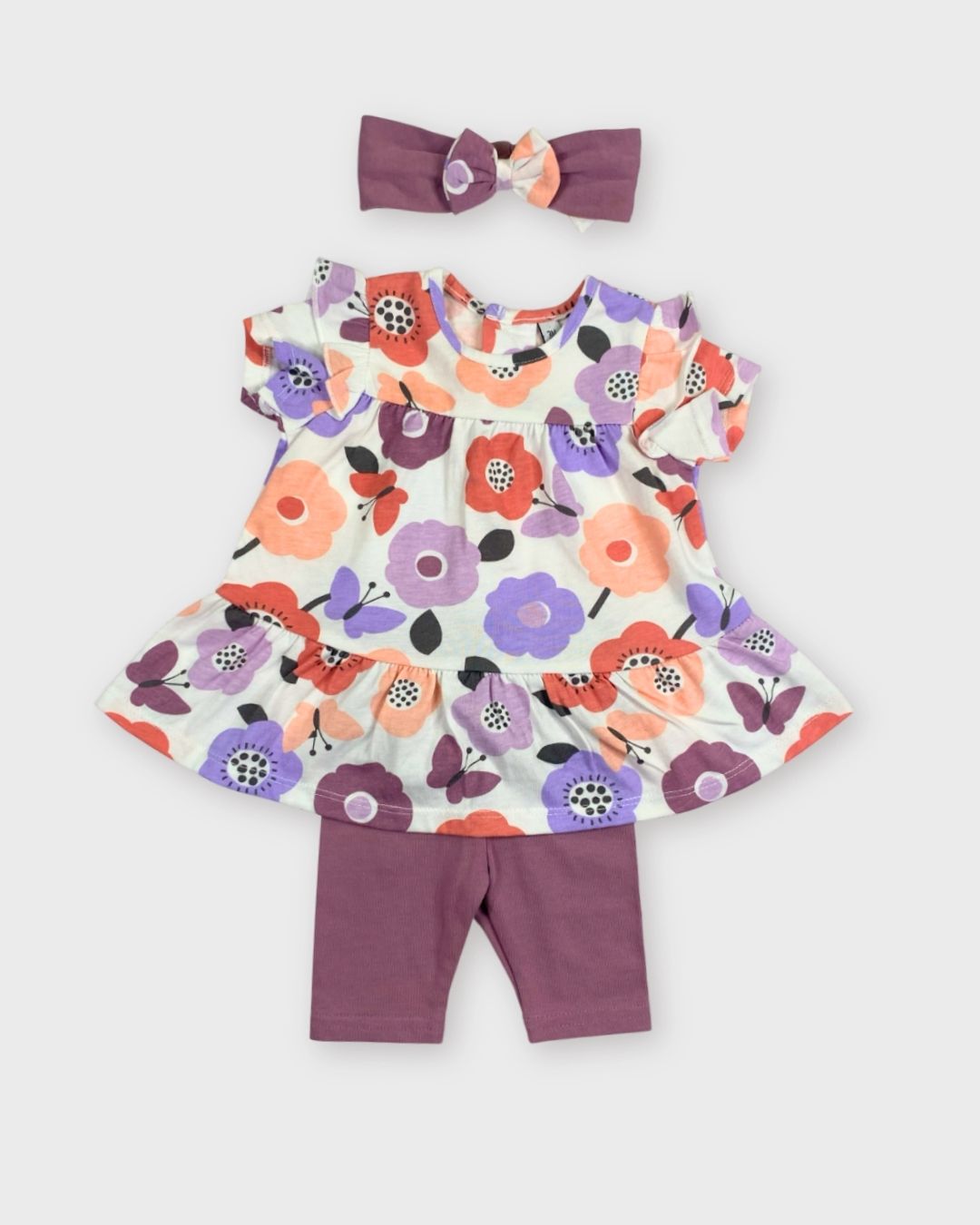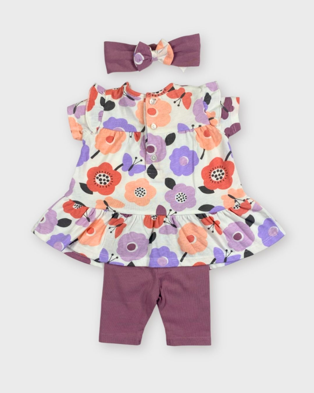 Un ensemble mauve fleuri composé d’une tunique et d’un legging Inconnue. Léger et parfait pour les beaux jours et les petites acrobaties. 🌸