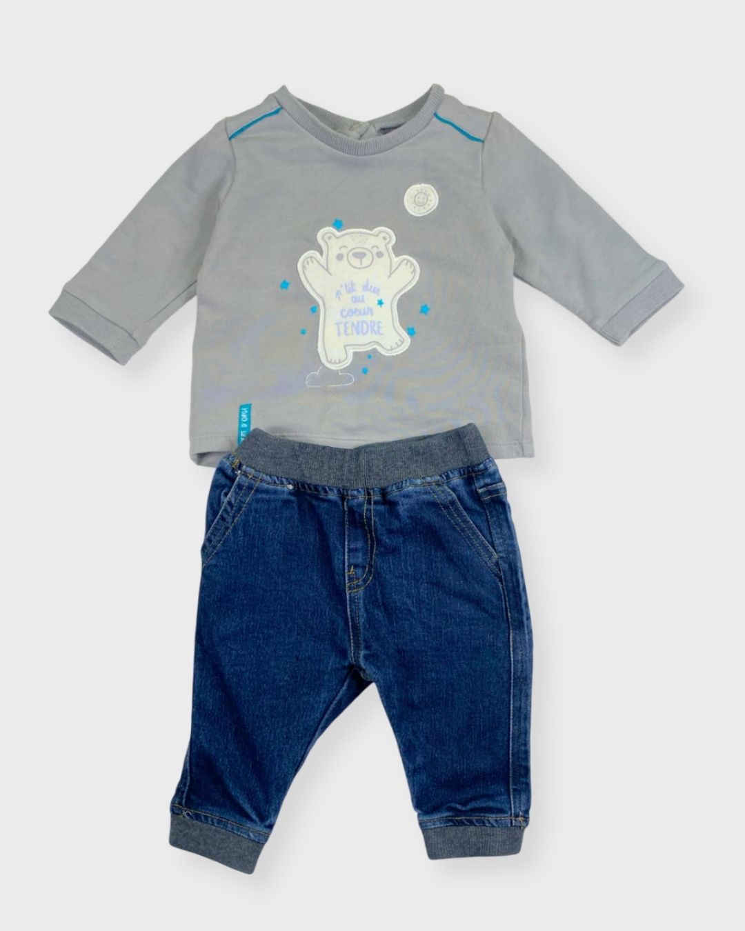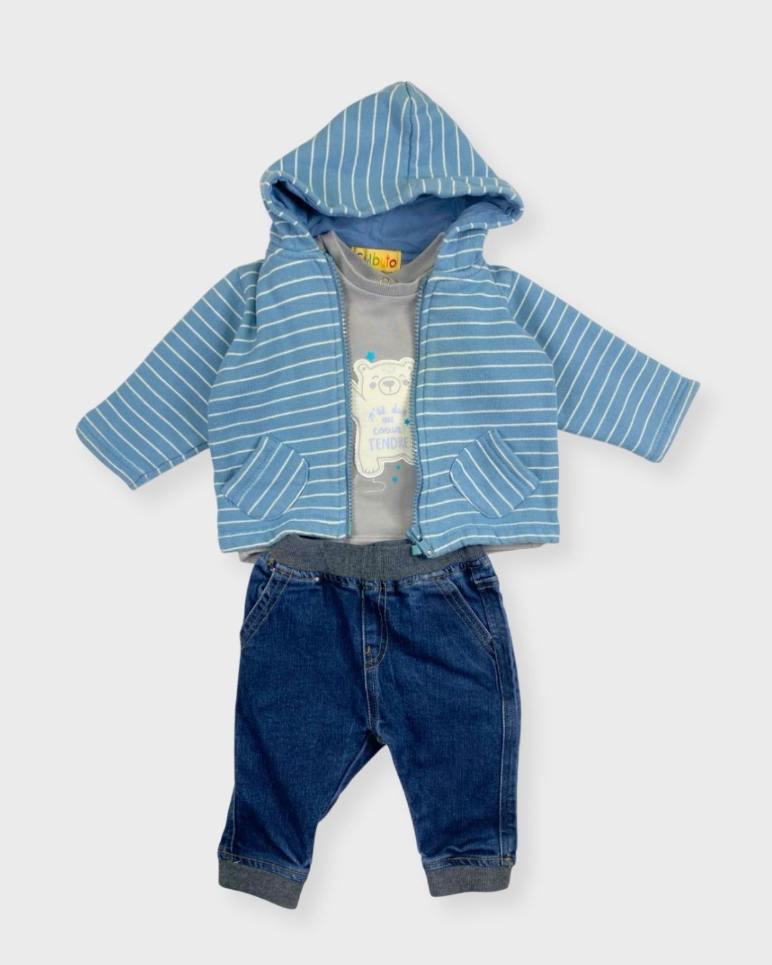 Ensemble garçon 3 mois, idéal pour la mi-saison : un jean Tissaia, un t-shirt manches longues Sucre d’orge avec un adorable ourson, et un gilet aux couleurs douces Culbuto. Un style complet et mignon à croquer. ✨🧸