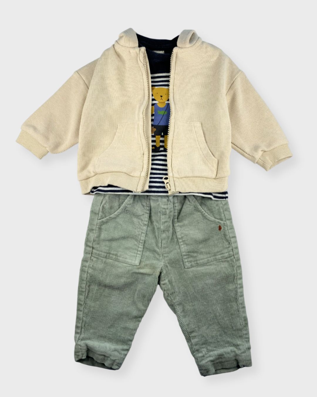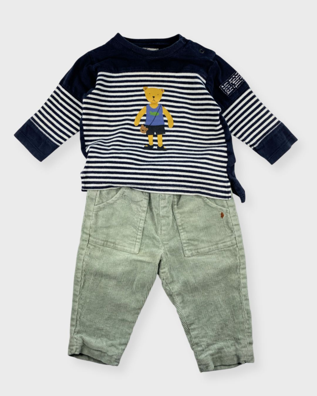 Ensemble trois pièces avec son pantalon signé Cadet Rousselle, sa marinière beaucoup trop mignonne provenant de Catimini et un gilet Kiabi pour tenir bien chaud.