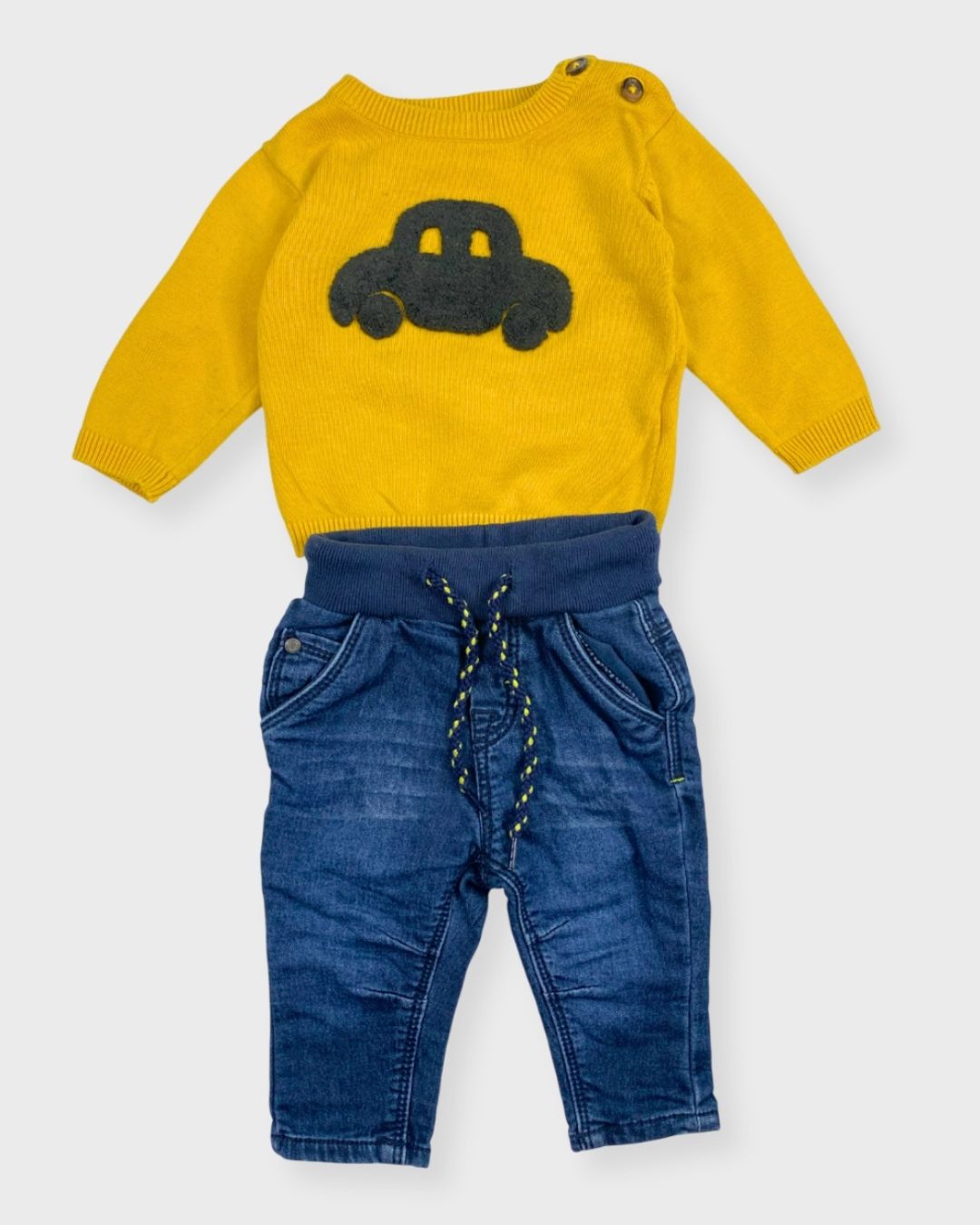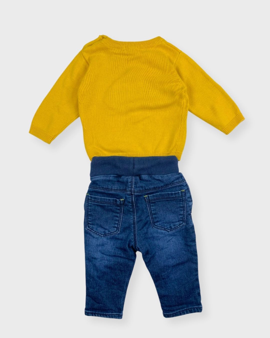 Un jean Grain de blé et un pull moutarde lumineux Kiabi pour réveiller les journées mi-saison. Moderne et plein de peps. 🌞✨